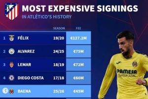 体育资讯7月2日讯 马竞已经官宣签下黄潜中场巴埃纳,《转会市场》也列出了马竞队史引援榜情况,菲利克斯断崖领跑。